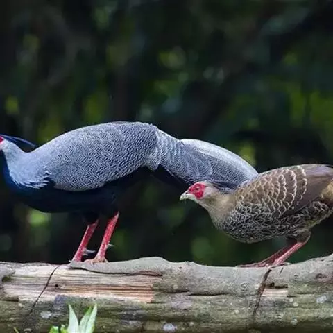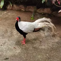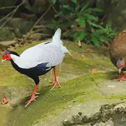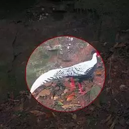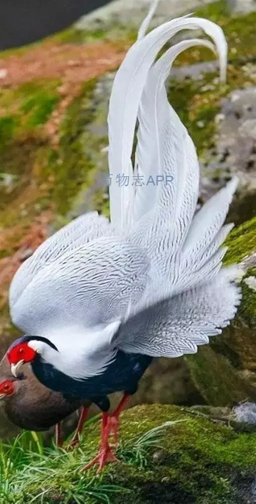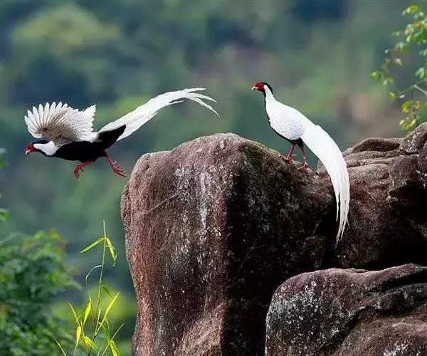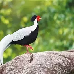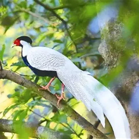 白鹇(学名:Lophura nycthemera):国家二级保护动物,属于大型鸡类。雄鸟全长100-119厘米,雌鸟58-67厘米。头顶具冠。嘴粗短而强壮,上嘴先端微向下曲,但不具钩;鼻孔不为羽毛所掩盖着。翅稍短圆。尾长。跗蹠裸出,雄性具距,但有时雌雄均有;趾完全裸出,后趾位置较高于他趾。雌雄异色;雄鸟上体白色而密布以黑纹,头上具长而厚密、状如发丝的蓝黑色羽冠披于头后;脸裸露,赤红色;尾长、白色,两翅亦为白色。下体蓝黑色,脚红色。雌鸟通体橄榄褐色,羽冠近黑色。