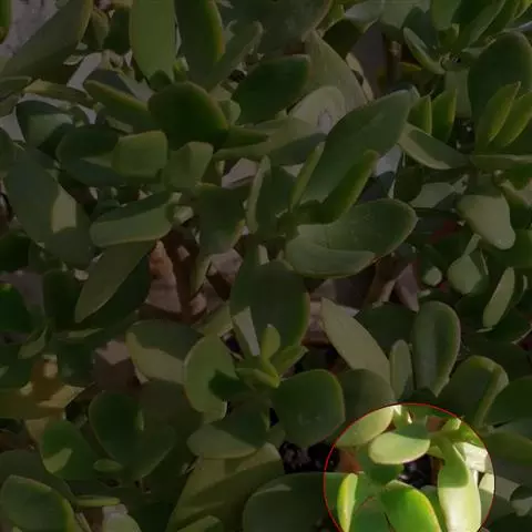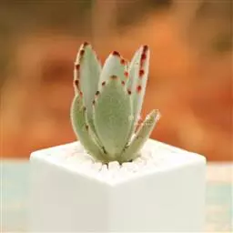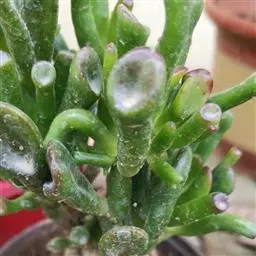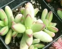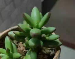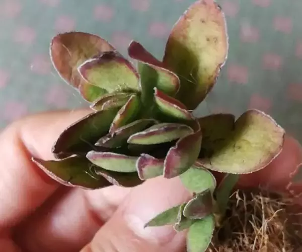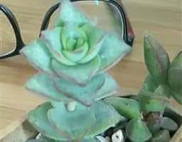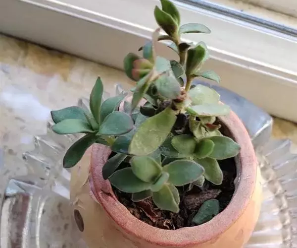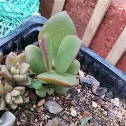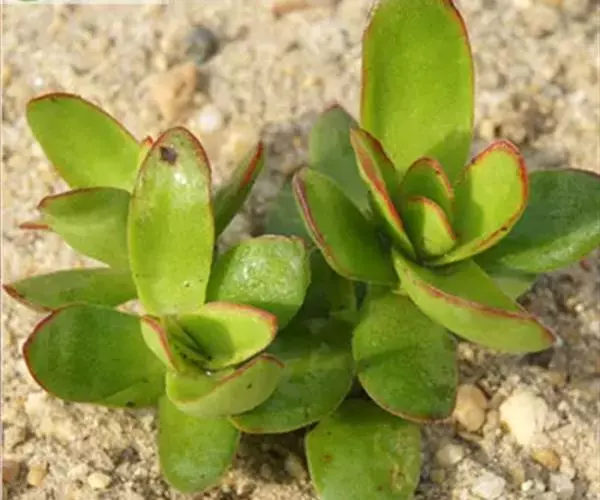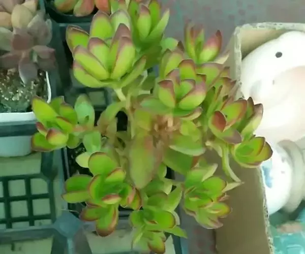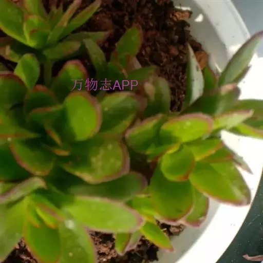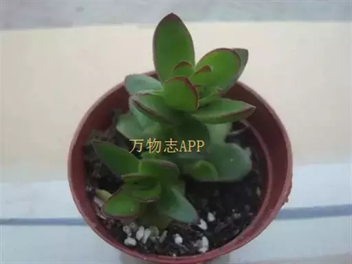 多年生肉质草本植物,植株丛生,有细小的分枝,茎肉质,时间养久了茎会 逐渐半木质化,天狗之舞叶片有点薄,叶片颜色绿,叶缘褐红色,在晚秋和早春,温差大的时候红褐色尤为明显。天狗之舞叶片交互对生无叶柄,基部连在一起,新叶上下叠生,成叶上下有些许间隔。开花为白色,4~5月开放。