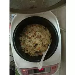 3、起油锅,倒入肉末,虾仁和青豆(或者你喜欢加什么)划炒片刻