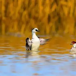 红胸秋沙鸭属中等食鱼鸭类,体长53厘米。嘴细长而带钩,捕食鱼类。丝质冠羽长而尖。雄鸟黑白色,两侧多…