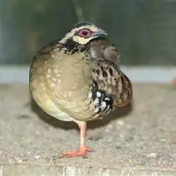 体大的灰褐色鹑类。胸灰色具黑色细纹。与相似种类四川雉鹑不同处在于栗色喉块外缘近白。有猩红色眼周裸皮。…