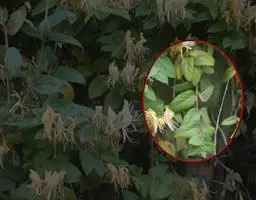 伞形花序着生于腋芽两侧各一,总梗长约0.5厘米;总苞片4,具缘毛,内有花15-17朵。雄花花被片6,黄绿色,近相等,椭圆形,先端圆,长约2毫米,宽约1.5毫米,外面被疏柔毛,内面无毛;雄蕊9,各轮近等长,长约1.8毫米,花丝无毛,第三轮的近基部着生2个具短柄宽肾形腺体,退化雄蕊成“凸”字形;花梗被疏柔毛,长约3.5毫米。雌花较小,花被片6,内、外轮近相等,椭圆形,先端圆,长1.2毫米,宽0.6毫米,内、外轮外面被较密柔毛,内面被贴伏疏柔毛;退化雄蕊9,条形,近等长,长约0.8毫米,第三轮的中下部外侧着生2个椭圆形无柄腺体;雌蕊长约1毫米,子房狭椭圆形,花柱粗,与子房近等长,柱头盘状;花梗约1毫米。果球形,直径7-8毫米,熟时红色。