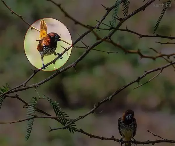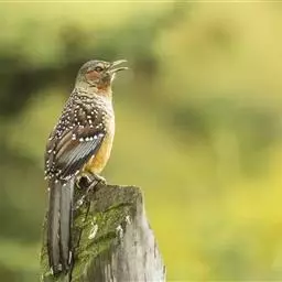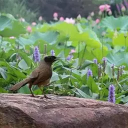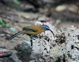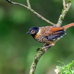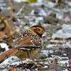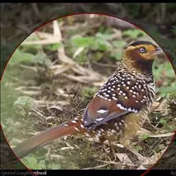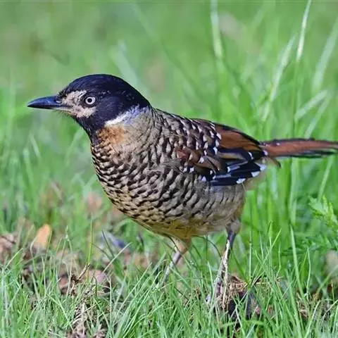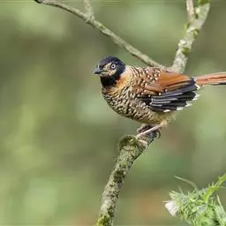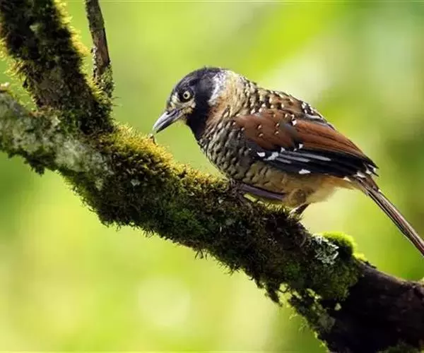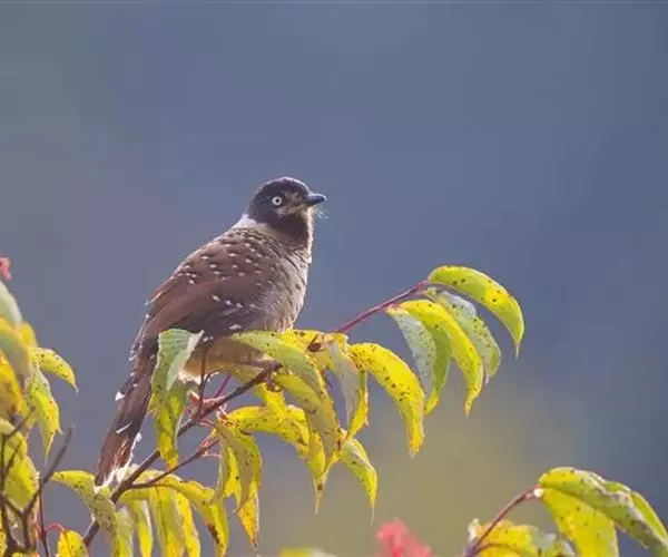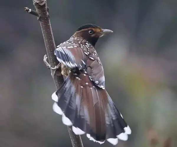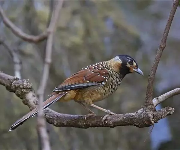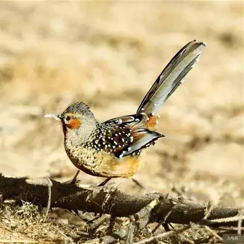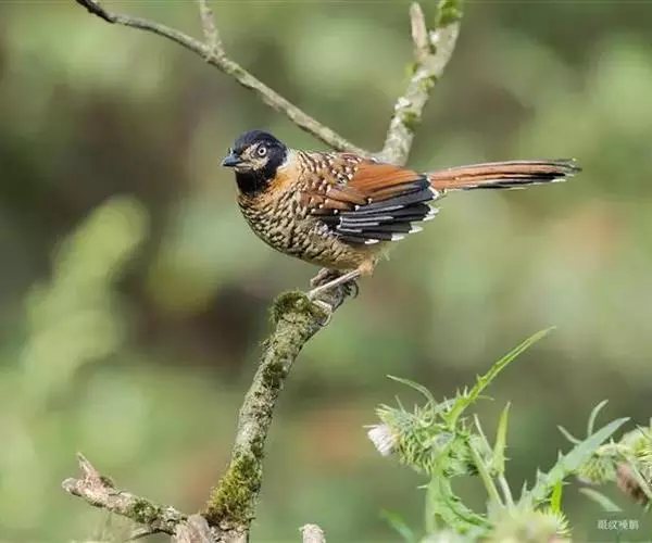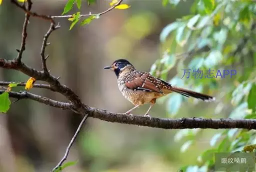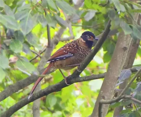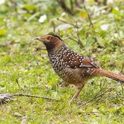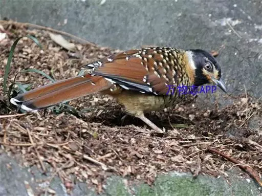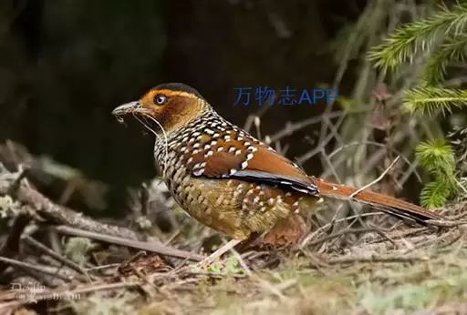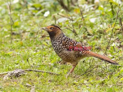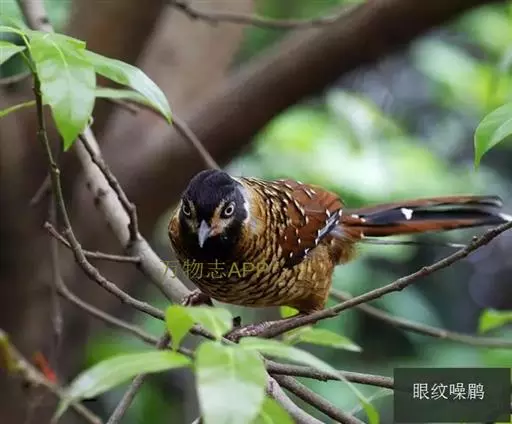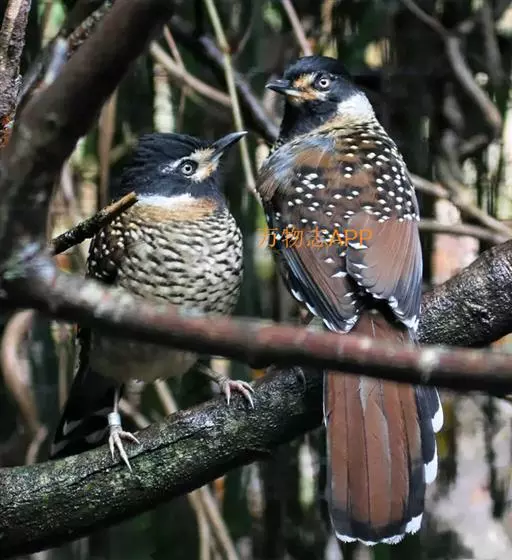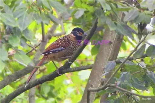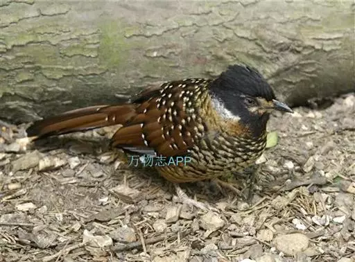 大噪鹛:中型鸟类,体长32-36厘米。额至头顶黑褐色,背栗褐色满杂以白色斑点,…