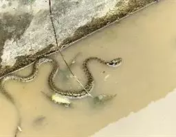 红脖颈槽蛇(学名:Rhabdophis subminiatus):为游蛇科颈槽蛇属的爬行动物,俗名野鸡项、红脖游蛇、扁脖子,属后毒牙类毒蛇。体型中等大小,全长约77-95厘米。头背草绿色,上唇鳞色稍浅,部分鳞沟黑色;头腹面污白色。躯干及尾背面草绿色,颈区及体前段鳞片间皮肤腥红色;躯干及尾腹面黄白色。头颈区分明显,颈及体前段背正中两行鳞片并列,个别无颈槽;眼较大,瞳孔圆形。上颔齿23-25枚,最后2枚骤然增大,与其前方齿列间有一间隙。