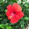 朱槿(学名:Hibiscus rosa-sinensis Linn. ):又名扶桑、佛槿、中国蔷薇。汉语拼音:zhujin。由于花色大多为红色,所以中国岭南一带将之俗称为大红花。常绿灌木,高约1-3米;小枝圆柱形,疏被星状柔毛。叶阔卵形或狭卵形,两面除背面沿脉上有少许疏毛外均无毛。花单生于上部叶腋间,常下垂;花冠漏斗形,直径6-10厘米,玫瑰红色或淡红、淡黄等色,花瓣倒卵形,先端圆,外面疏被柔毛。蒴果卵形,长约2.5厘米,平滑无毛,有喙。花期全年。