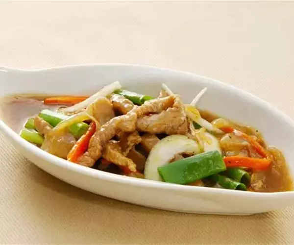 主要材料:里脊肉150克,洋葱10克,红辣椒1个,青辣椒1/2个,生姜1小块,淀粉适量