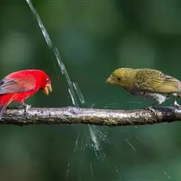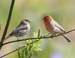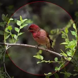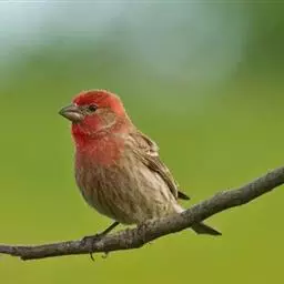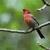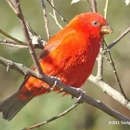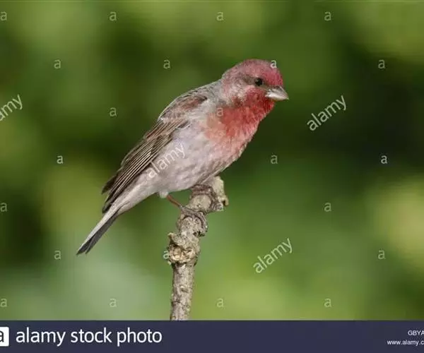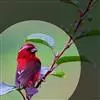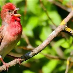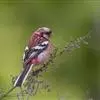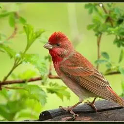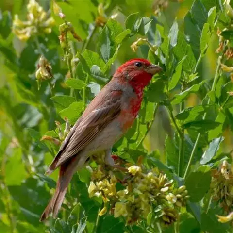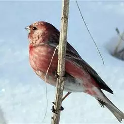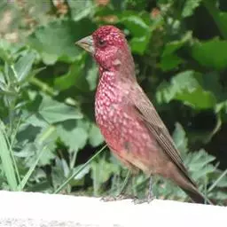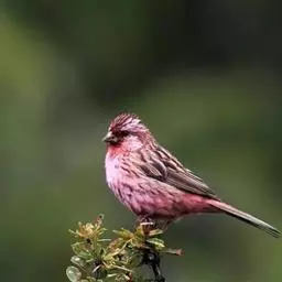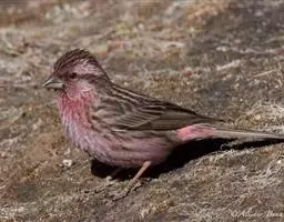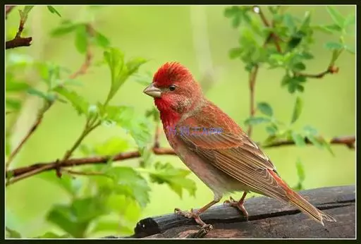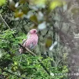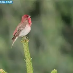 红腰朱雀:体长12-14厘米,小型鸟类。雄鸟前额和眉纹玫瑰粉红色,头顶和一宽的贯眼带深红褐色,背红…