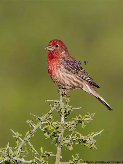 长尾朱雀:体长18厘米,体重16-26克。雄鸟额、颏和眼后为暗红色,…