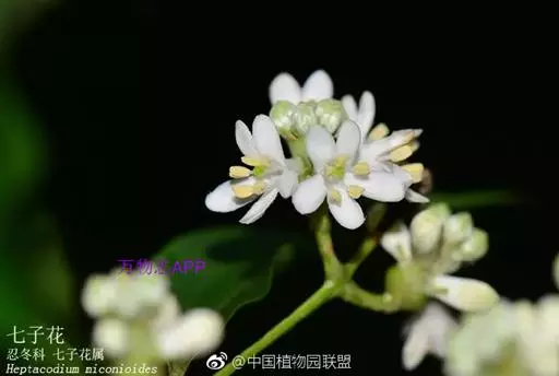 七子花(拉丁学名:Heptacodium miconioides Rehd.)是忍冬科,七子花属落叶小乔木,中国特有,一般树高达7米;树皮灰褐色,片状剥落;幼枝略呈四棱形,红褐色。叶对生,厚纸质,卵形至卵状长圆形,圆锥花序顶生,由多数密集呈头状的穗状花序组成;穗状花序,花冠白色,稍芳香,该种于3月中下旬展叶,5月上中旬出现花蕾,到7月初开花,花期较长,可延至9月上旬,果实于10月成熟。
