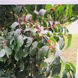 七子花吸引人的地方不仅仅是它的花和果,它还有醒目的波浪状卷曲的叶子,叶长7.5-10cm,叶基心形,叶尖有三条深色的条纹。叶对生,通常能保留到11月份才脱落,有时,特别是旱季,叶子常呈现出秋天的深紫色。到了冬天,主茎上的树皮是一种吸引人的浅褐色,呈薄纸层条状剥落,花开在当年生枝条上,所以修剪老枝时,应选择在晚秋季节。