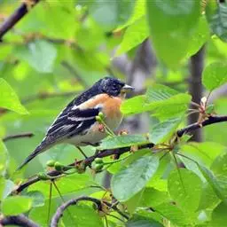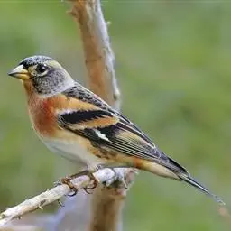 燕雀(学名:Fringilla montifringilla)属小型鸟类,体长14-17厘米。嘴粗壮而尖,呈圆锥状。雄鸟从头至背辉黑色,背具黄褐色羽缘。腰白色,颏、喉、胸橙黄色,腹至尾下覆羽白色,两胁淡棕色而具黑色斑点。两翅和尾黑色,翅上具白斑。雌鸟和雄鸟大致相似,但体色较浅淡,上体褐色而具有黑色斑点,头顶和枕具窄的黑色羽缘,头侧和颈侧灰色,腰白色。除繁殖期间成对活动外,其他季节多成群,尤其是迁徙期间常集成大群,有时甚至集群多达数百、上千只,晚上多在树上过夜。主要以草子、果食、种子等植物性食物为食,尤以杂草种子最喜吃,也吃树木种子、果实。分布于北欧、亚洲、从挪威到勘察加、南欧、中国等地。