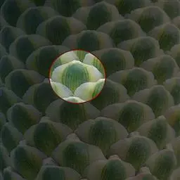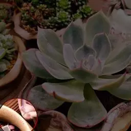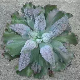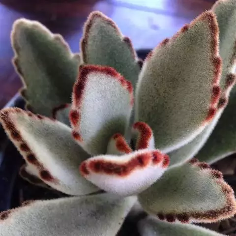 蓝苹果多肉植株常呈莲座状株型,易从茎的下部长出新枝,形成群生态,渐变成老桩。叶片,匙形,轮生,莲座状排列,肉质饱满,略显扁平,叶背有些凸起,有龙骨线,叶面平,或微微内凹,叶端稍收窄、收尖,叶色较为丰富,随季节、温差的变化而变化,有蓝绿色、紫色、漂亮的果冻色等,叶端有桃红色、粉红色、或是玫瑰红色的色晕,老叶的叶面、叶背有大面积的红晕,出状态时红得更加浓烈、更加令人陶醉,叶面被有白粉。