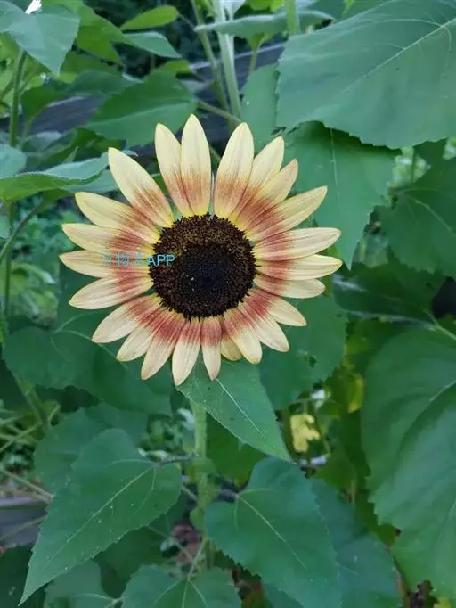 矮种向日葵,植物多分枝,株高70~85厘米,花径10-12厘米。盛开时具有辉煌的黄色和奶油色,甚至红黄双色,舌状花由米黄色向褐红色过渡,心盘黑色。非常可爱;该品种于1992年推出。