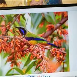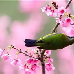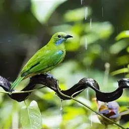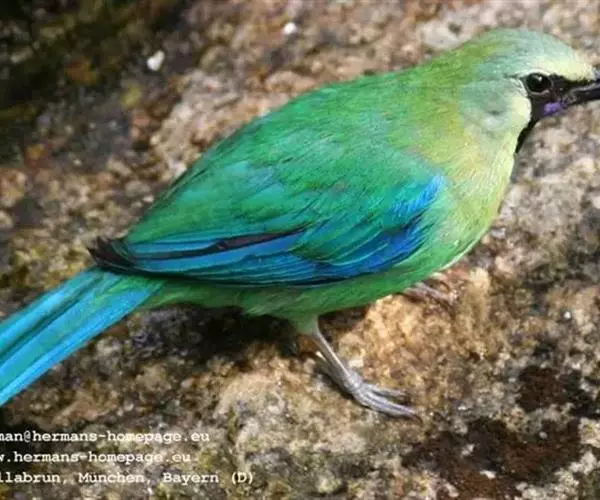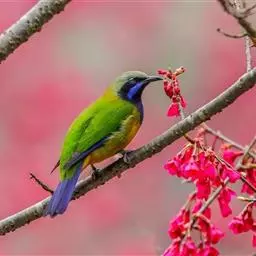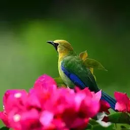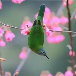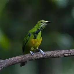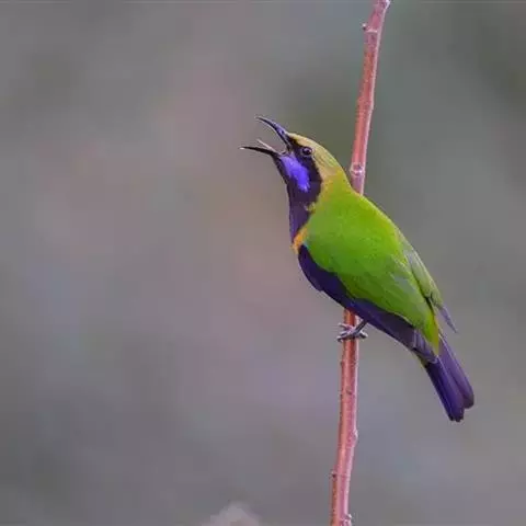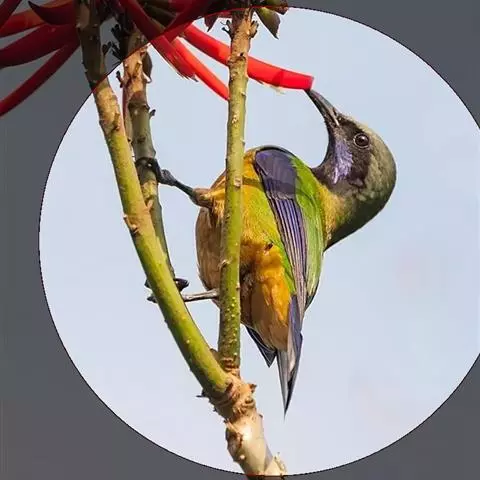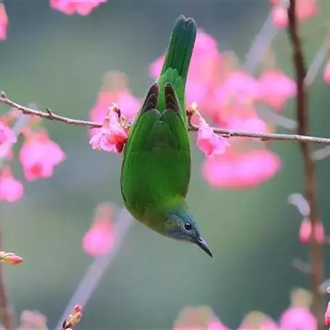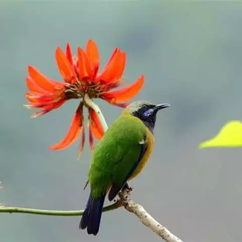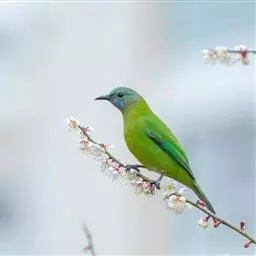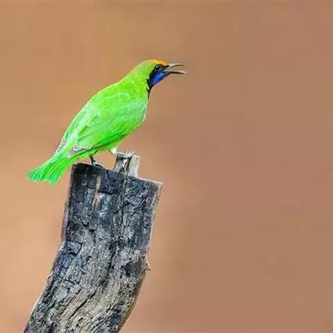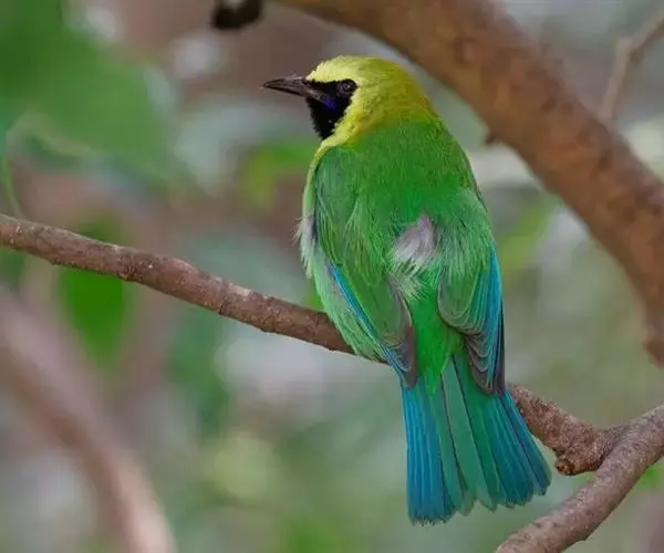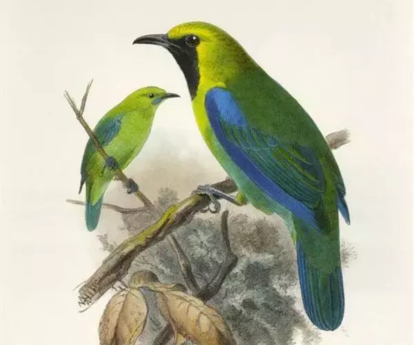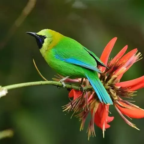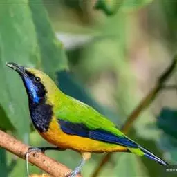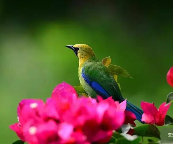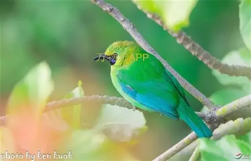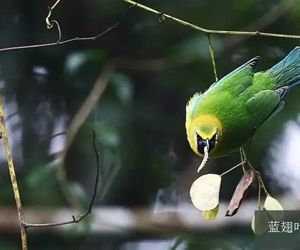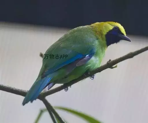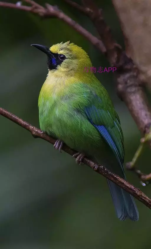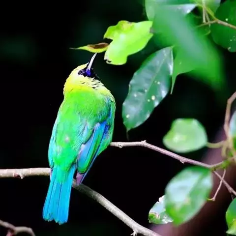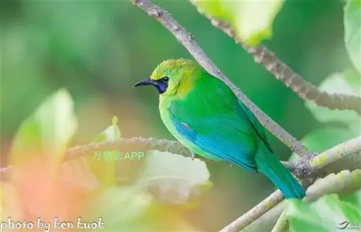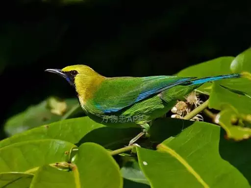 蓝翅叶鹎:小型鸟类,体长15-18厘米。雄鸟通体草绿色,尾蓝绿色,肩和翅亮蓝 色,胸缀有黄色,…