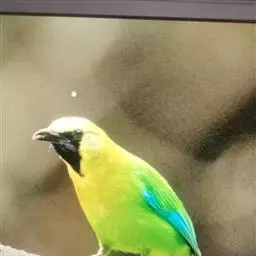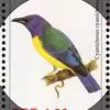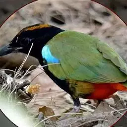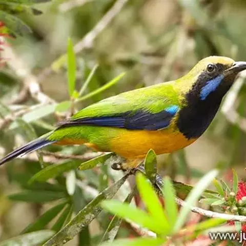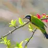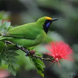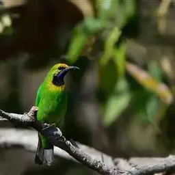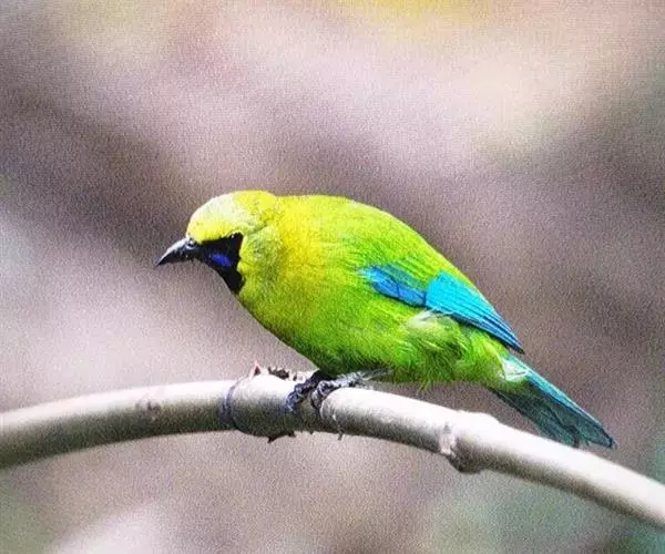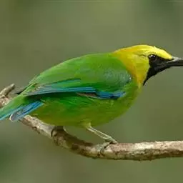 蓝翅叶鹎(学名:Chloropsis moluccensis):小型鸟类,体长15-18厘米。雄鸟通体草绿色,尾蓝绿色,肩和翅亮蓝 色,胸缀有黄色,颏、喉黑色。雌鸟颏,喉蓝绿色。