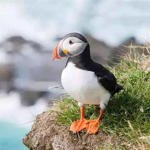 角海鹦体重581-648克,体长约32厘米,翼展18-20厘米。背部的羽毛呈黑色,腹部呈白色,脚呈橘红色,面部颜色鲜艳,有一张大嘴巴,呈三角形,带有一条深沟。像鹦鹉那样美丽可爱。因此,人们称它为海鹦。可是走到近处一看,它有一副一本正经的严肃面孔。它那宽大而鲜艳的喙带有灰蓝、黄和红三种颜色,配上两颊的灰白色,酷似马戏团中的小丑。前趾间有蹼膜,后趾缺如。翅窄而短小,尾短。体羽黑白二色,雌雄羽色相似。繁殖季节时,海鹦的喙会变得更加鲜艳,一旦繁殖过后,它们的喙又会变得细小而黯淡。