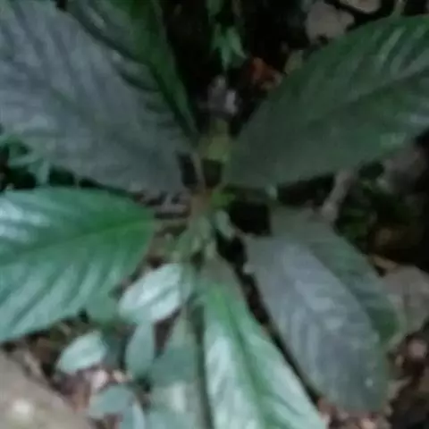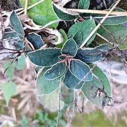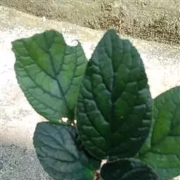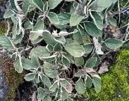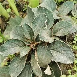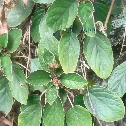 叶对生,密集于茎近顶端,具叶柄;叶片长圆形或狭椭圆形,长3-12厘米,宽2-5.5厘米,顶端钝,基部圆形,边缘密生小钝齿,上面密被短糙伏毛,下面和叶柄密被锈色或灰色毡毛,侧脉每边5-6对,上面不明显,下面隆起;叶柄长1.5-7厘米。