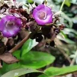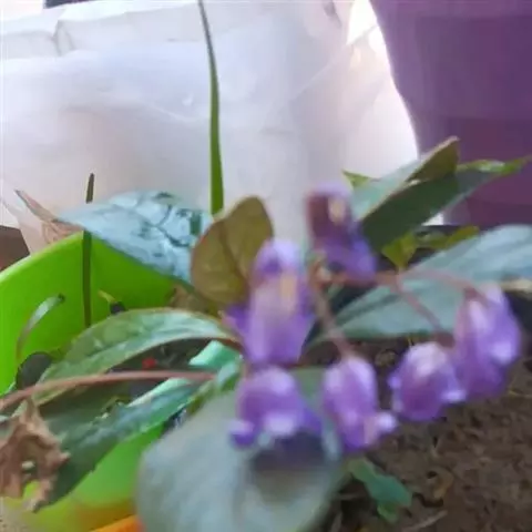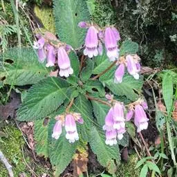聚伞花序伞状,成对腋生,通常具5-10花;花序梗长4-8.5厘米,被锈色毡毛,果期逐渐脱落至近无毛;苞片2,卵形,长7-9毫米,宽4-6毫米,被锈色或灰色短毡毛;花梗细,长5-7毫米,被疏柔毛或近无毛。花萼5裂至近基部,裂片相等,线形,长约4毫米,近无毛。花冠狭钟形,淡紫色,稀紫红色,长约1.3厘米,直径约9毫米,外面无毛;筒短而宽,长约7毫米,直径约6毫米;檐部二唇形,上唇比下唇短,长6.5毫米,2裂,下唇长3.5毫米,3裂,裂片近相等,全部裂片近圆形,长3-4.5毫米,宽约4毫米,顶端圆形。雄蕊2,着生于花冠近基部,花丝上部膨大似囊状,具腺状短柔毛,下部弯曲变细而扁平,长4-5毫米,花药大,狭长圆形,两端尖,长3毫米,宽约1.5毫米,顶端连着;退化雄蕊2,长1.2-1.5毫米,着生于距花冠基部2毫米处。无花盘。雌蕊无毛,长约1厘米,子房狭长圆形,长约6毫米,直径约1.2毫米,花柱长4毫米,柱头1,头状。