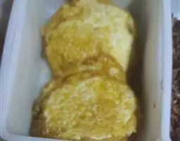 2. 将面包切去外壳,然后切方丁(烘或炸干更佳),放入盆内加去了皮籽并且成丁的苹果,拌匀后,装入铺有糖底的 模具内。