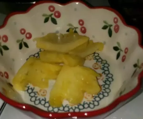 3. 将玉米糊与果脯汁,果脯肉,柠檬汁混合在一起,装入碗中摊凉后送进冰箱。