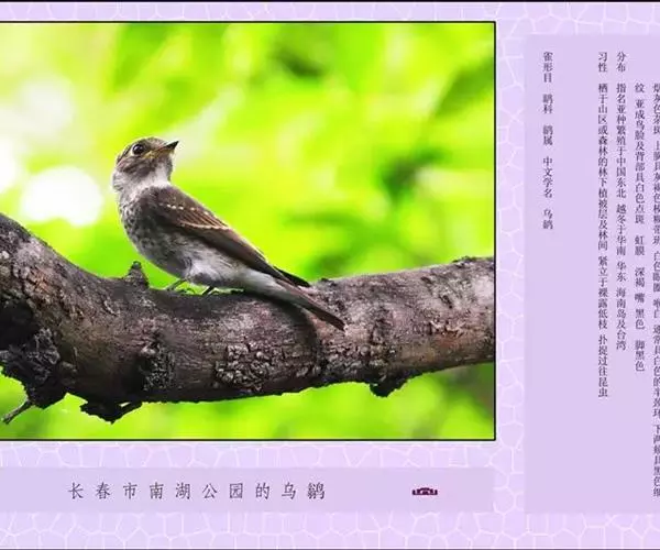 乌鹟(学名:Muscicapa sibirica):体重9-15克,体长12-14厘米。是一种体型略小的烟灰色鹟。上体深灰,翼上具不明显皮黄色斑纹,下体白色,两胁深色具烟灰色杂斑,上胸具灰褐色模糊带斑;白色眼圈明显,喉白,通常具白色的半颈环;下脸颊具黑色细纹,翼长至尾的2/3。诸亚种的下体灰色程度不同。亚成鸟脸及背部具白色点斑。虹膜深褐色,嘴黑色,脚黑色。