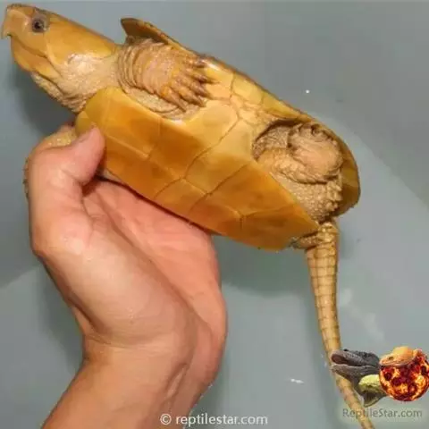 四肢强,被有覆瓦状排列的鳞片。前缘大鳞排列成行。前肢5爪,后肢4爪。指、趾间具蹼。尾长,几与背甲等长,其上覆以环状排列的矩短形鳞片。尾基部为7枚一环,4枚位于腹面,1枚位于背面,侧面各1枚;中部为5枚成一环,背侧部各1枚,腹面2枚;末端为3枚成一环,背一枚,腹2枚;尾梢为1枚鳞片。尾背鳞片大,从基部至尾梢一纵行约30枚。颏与喉部具扁平圆疣,股后及尾基两侧有长圆锥形棘突,雄性更甚。 头、背甲、四肢及尾背均为棕红色、棕橄榄色或橄榄色。头背有深棕色细线纹,头侧眼后及颚缘有棕黑色纵纹。背甲有虫蚀纹及浅黄色细点。每一盾片上的放射纹为黑褐色,盾缘色较深。腹甲及缘盾腹面为黄橄榄色,有的缀有黄点。四肢前缘的成排大鳞上,有黄色斑点或桔黄色斑点。雄性头侧、咽、颏及四肢均缀有桔红色斑点。 幼体头相对较小,盾片上的疣轮及辐射纹清晰。缘盾宽,在第八枚缘盾以后,背甲后缘呈锯齿状。与成体相反,幼体椎盾宽或微宽于肋盾,背甲灰绿、棕或红棕色。问杂细碎黑斑。头腹桔红色。