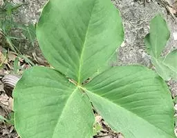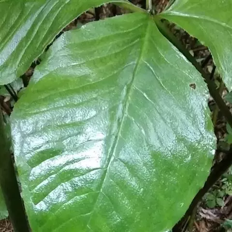 块茎扁球形,具小球茎。鳞片向上渐狭,内面的长约12厘米。叶2(-1),叶柄长15-30厘米,粗7-8毫米,下部1/3具鞘,鞘管状,口部截形;叶片3全裂,裂片无柄或具短柄,中裂片宽椭圆形,长16-23厘米;侧裂片偏斜,长圆形或椭圆形,长15-18厘米,宽均在10厘米以上,先端渐尖,具长1-1.5厘米的锥状突尖,侧脉脉距约1厘米,集合脉距边缘5毫米。