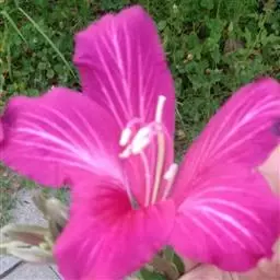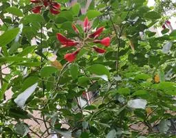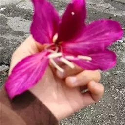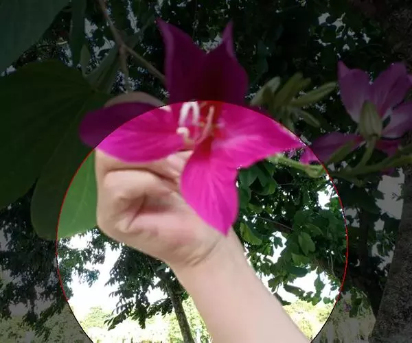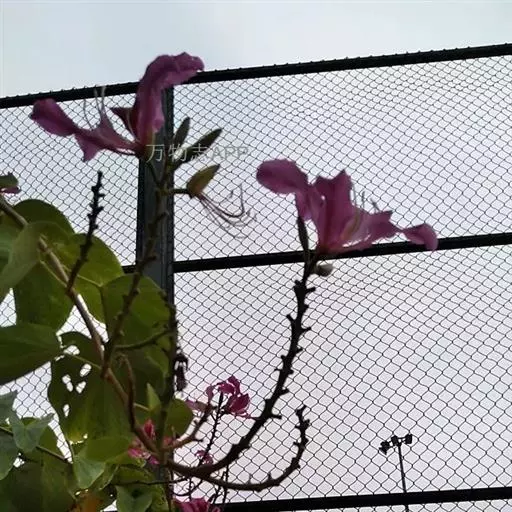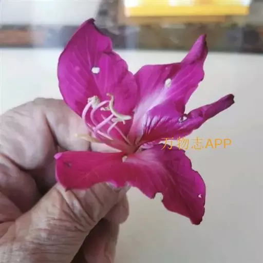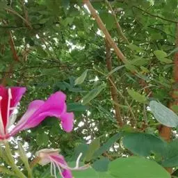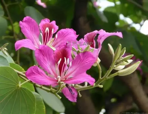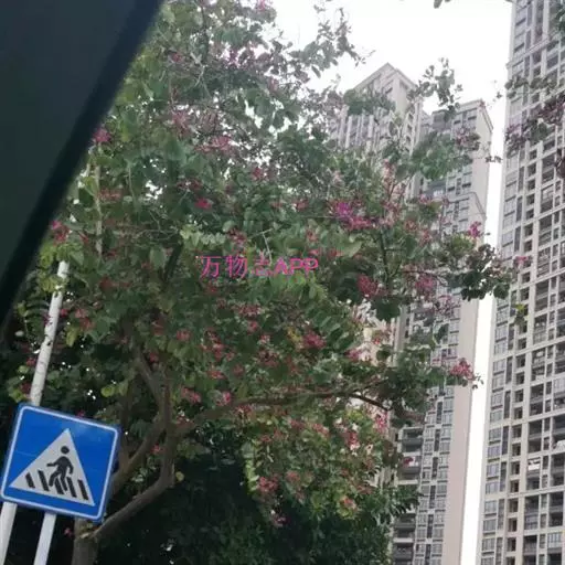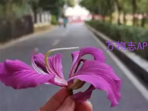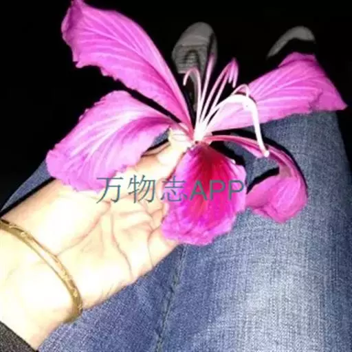 红花羊蹄甲(学名:Bauhinia blakeana Dunn):常绿乔木,树高6-10米。叶革质,圆形或阔心形,长10-13厘米,宽略超过长,顶端二裂,状如羊蹄,裂片约为全长的1/3,裂片端圆钝。 总状花序或有时分枝而呈圆锥花序状;红色或红紫色;花大如掌,10-12厘米;花瓣5,其中4瓣分列两侧,两两相对,而另一瓣则翘首于上方,形如兰花状;花香,有近似兰花的清香,故又被称为“兰花树”。花期十一月至翌年四月。花大如掌,略带芳香,五片花瓣均匀地轮生排列,红色或粉红色,十分美观。