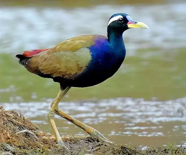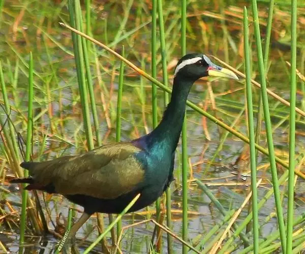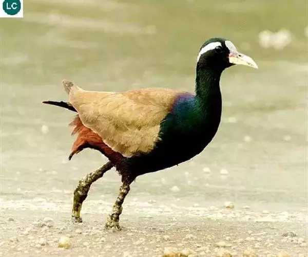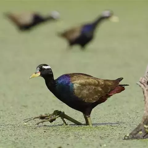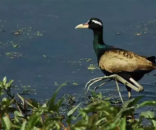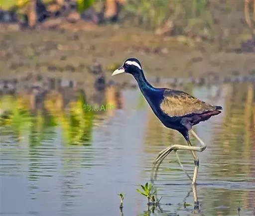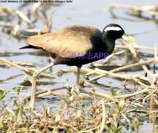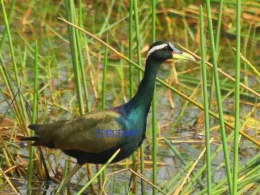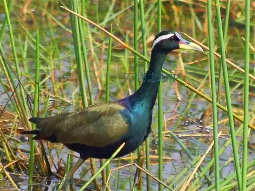 铜翅水雉(学名:Metopidius indicus):是小型涉禽,体长28-31厘米。头颈、下体黑色,具金属色辉。从眼到颈有白色纵纹,背、内侧初级一飞羽橄榄铜绿色,尾下覆羽栗色。跗蹠的前后均有盾状鳞,趾、爪均甚长,后爪特别长。栖息于热带开阔的田坝区,单个或成对在沼泽湿地中活动觅食。捕食昆虫、蜗牛、小鱼和水生植物。配偶为一雌多雄制,雌鸟常常拥有很多个雄鸟。雄鸟的领域性极强,常常为保卫领域而彼此争斗。7-8月产卵,巢用杂草铺垫而成,每窝产卵4枚。