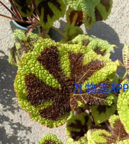 真菌病害,由葡萄孢菌引起的灰霉病症状:秋海棠叶片灰霉病经常发植株的下部,尤其是根茎处与基质接触的地方更容易感染病菌,被水浸润的病斑很快会扩散到整个叶整个植株,受害区域呈现坏死斑点,逐渐由褐色转变为黑色。当夜间温度较低、白天温度较高而且湿高时,病原孢子生长加快,受害的叶片上会长出灰绿色的霉状物。
