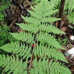 植株高约2米。根状茎长而横走,粗壮,粗达5毫米,密被栗褐色鳞片;鳞片质厚光泽,披针形,先端往往扭曲。叶大,疏生;柄长约1米,基部粗达5毫米,圆形,红色,有光泽,基部具微细疣状突起而略粗糙,向上平滑;叶片三角形或长圆状三角长50-100厘米,二至三回羽状;羽片对生,平展或斜展,或上部的旱镰刀形而斜向无柄,基部有托叶状的小羽片1对,基部一对羽片通常较大,一般中型植株的基部羽片25-45厘米,宽13-30厘米,长三角形,先端尖,基部截形,一回羽状或二回深羽裂;羽片多数,对生,平展,无柄,下部1-3对较大,或第二、第三对较大而基部一对略缩长10-15厘米,宽3-4厘米,披针形或长圆披针形,长尾头(尾长2.5-4厘米),截形至阔楔形,一回羽状或深羽裂达小羽轴;裂片6-9对,对生,平展或略斜展,通常二对较大,长约1.5-4厘米,宽5-8毫米,长圆形或长圆披针形,钝头或短渐尖,基部小羽轴多少合生,两侧略膨大,下侧多少下延,有狭翅相连或彼此远分离而小羽轴无翅,间隔与裂片等宽或较宽,全缘或羽裂达1/2,边缘波状或具波状圆齿;第二对距基部一对10厘米以上,和基部一对同形,向上各对羽片均略变小。叶脉网状,网眼角形或六角形,沿主脉及小羽轴两侧的1列网眼较长而整齐,向叶边的较小,两面显。叶干后草质或纸质,上面褐绿色,下面灰绿色或浅灰色,均无毛;叶轴及各回羽由栗红色渐变为棕禾秆色以至禾秆色,有光泽,无毛,上面有浅纵沟。