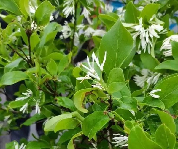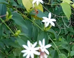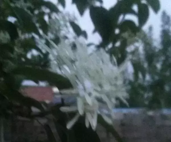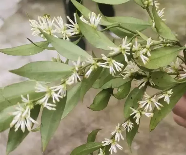 聚伞状圆锥花序,长3-12厘米,顶生于枝端,近无毛;苞片线形,长2-10毫米,疏被或密被柔毛,花长1.2-2.5厘米,单性而雌雄异株或为两性花;花梗长0.5-2厘米,纤细,无毛;花萼长1-3毫米,4深裂,裂片尖三角形或披针形,长0.5-2.5毫米;花冠白色,4深裂,裂片线状倒披针形,长(1-)1.5-2.5厘米,宽0.5-3.5毫米,花冠管短,长1.5-4毫米;雄蕊藏于管内或稍伸出,花丝长在0.5毫米之下,花药长卵形,长1.5-2毫米,药隔突出;子房卵形,长1.5-2毫米,柱头球形,稍2裂。
