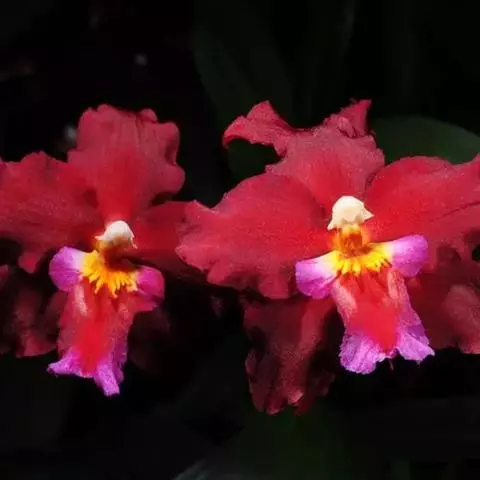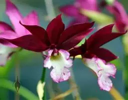 卡特兰(红色) 大部分由蕾丽兰亚族的蕾丽兰、卡特兰、白拉索兰中的2~3种杂交而成,也有原生卡特兰,如走路人(Cattleyawalkeriana)。 多年生草本。假鳞茎棍棒状,长10~15厘米,顶生叶片,革质,淡绿色,花大紫红色。栽培品种色彩丰富,有白、黄、橙红、深红、紫红和复色。常见品种有黄色的“香山”、“落曰”,绿色的“榆林”,白色的“优美”,粉红色的“真美”,红色的“火球”,紫红的“长河”、双色的“圣诞糖果”等。