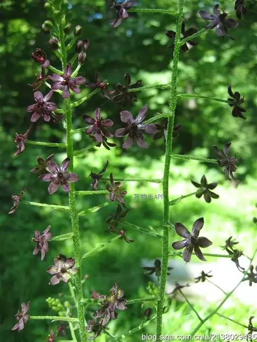 圆锥花序通常疏生较短的侧生花序,最下面的侧生花序偶尔再次分枝;总轴和枝轴密生绵状毛;花多数,疏生;花被片黑紫色,开展或反折,近倒卵状矩圆形,通常长5-7毫米,宽2-3毫米,先端钝,基部无柄,全缘;花梗长约为花被片的2倍,长可达1厘米或更长,在侧生花序上的花梗比顶生花序上的花梗短;小苞片长3-4毫米,背面和边缘生毛;雄蕊长约为花被片的一半;子房无毛。