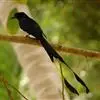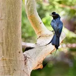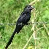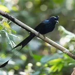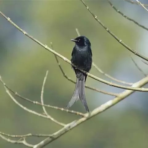 发冠卷尾是中型鸟类,体长28-35厘米。通体绒黑色缀蓝绿色金属光泽,额部具发丝状羽冠,…