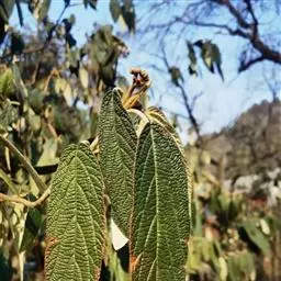 皱叶荚蒾是五福花科荚蒾属的小乔木植物。植株高达4米;叶柄及花序均被由黄白色、黄褐色或红褐色簇状毛组成的厚绒毛;小枝粗壮,稍有棱角;叶革质,卵状矩圆形至卵状披针形;聚伞花序稠密,总花梗粗,四角状,花冠呈现白色,雄蕊高出花冠;果实红色,后变黑色,宽椭圆形,无毛;花期为4-5月;果熟期为9-10月。皱叶荚蒾原产于中国,分布于陕西、湖北、四川及贵州等地。生长于山坡林下或灌丛中,海拔800-2400米。其性喜好阳光,耐半阴,喜温暖,有一定的耐寒性,喜湿润,不耐涝,耐中度盐碱,但在深厚肥沃、排水良好的中性或微酸性沙质土壤中生长更好,耐修剪,生长缓慢。其一般的繁殖方式为播种和扦插繁殖。皱叶荚蒾味苦,性凉。具有清热解毒、凉血止血的功效。可用于湿热痢疾、痈疽疮疖、咳血、吐血、便血、跌打损伤等疾病。皱叶荚蒾给人以郁郁葱葱的景象,全年观叶、春季观花