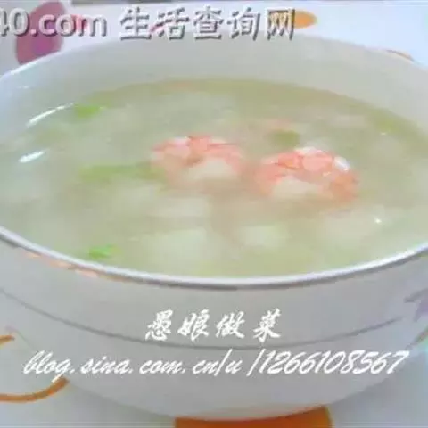 3 虾仁随冷水入锅煮至酥烂再加冬瓜同煮至冬瓜熟,少许盐、鸡精调味后盛入场碗。(调味品尽量少放)