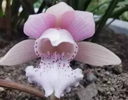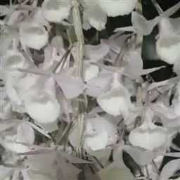 花葶从假鳞茎侧面发出,直立,长20-30厘米,中下部有2-3枚筒状鞘;总状花序通常多少缩短,长2-6厘米,具较密集的花;花苞片卵状披针形,长3-5毫米;花梗和子房长7-12毫米;花10余朵或更多,通常白色并有紫纹;萼片长圆状披针形,长9-11毫米,宽2.5-3.5毫米,先端渐尖;侧萼片斜歪并略宽于中萼片。
