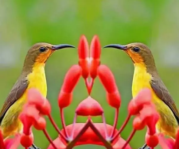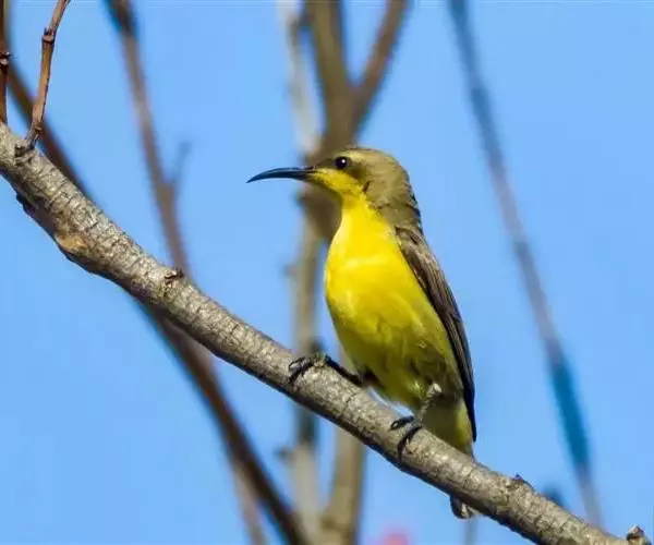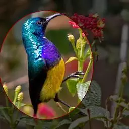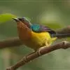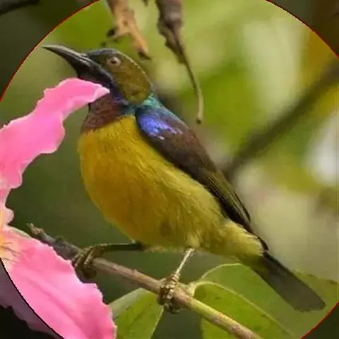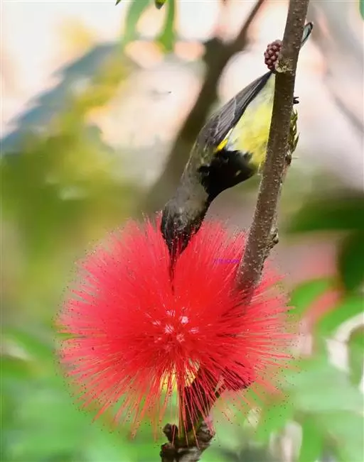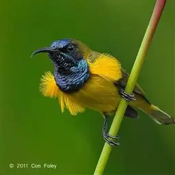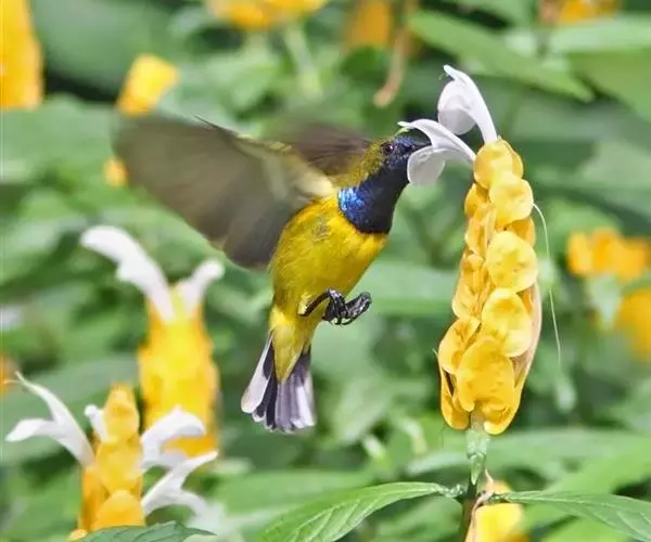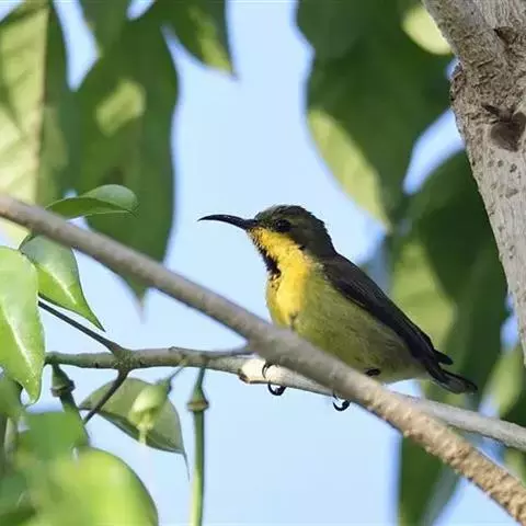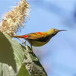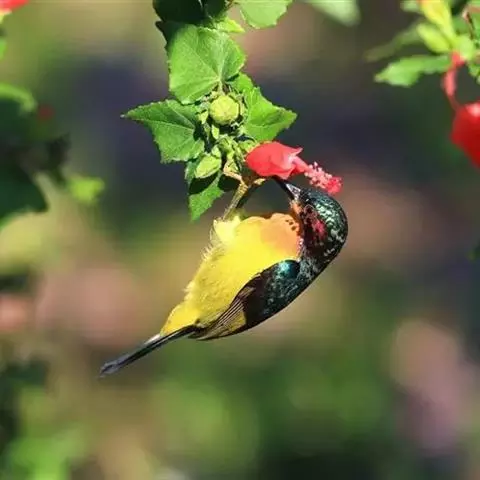 黄腹花蜜鸟(学名:Cinnyris jugularis):为太阳鸟科花蜜鸟属的鸟类。体重5-9克,体长97-115毫米。是一种体型小的花蜜鸟。腹部灰白。雄鸟颏及胸金属黑紫色,有绯红及灰色胸带,具艳橙黄色丝质羽的肩斑,上体橄榄绿色,繁殖期后金属紫色缩小至喉中心的狭窄条纹。雌鸟无黑色,上体橄榄绿色,下体黄,通常具浅黄色的眉纹。虹膜深褐色,嘴及脚黑色。