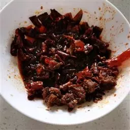3.锅入油至六成热,放入牛肉馅煸干水分后,加入黄酒,再加入豆瓣酱炒出红油;