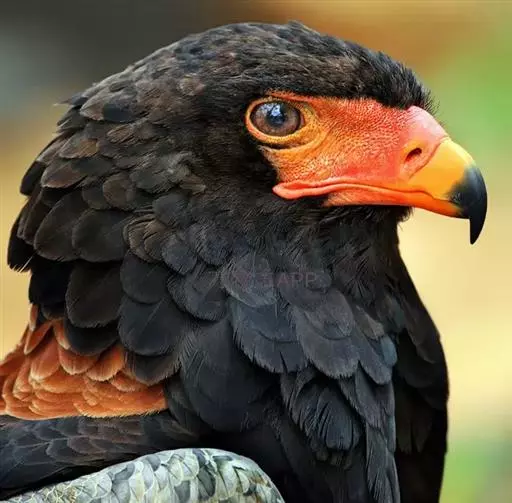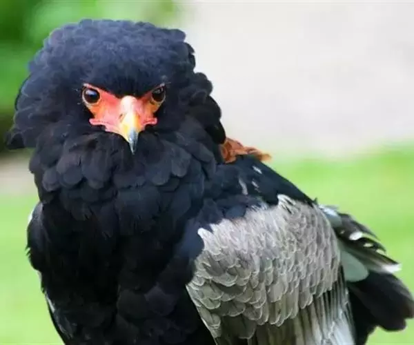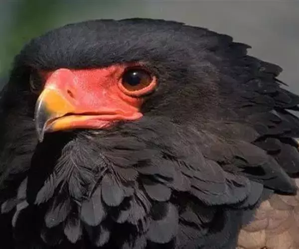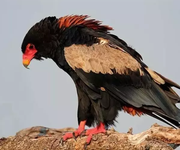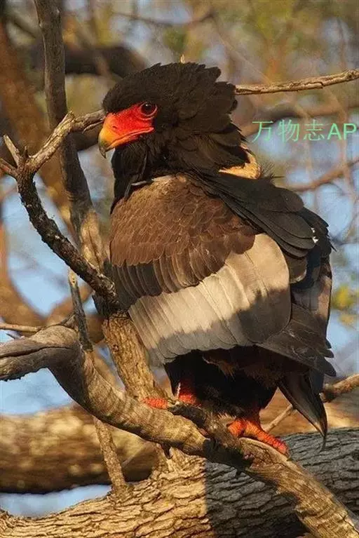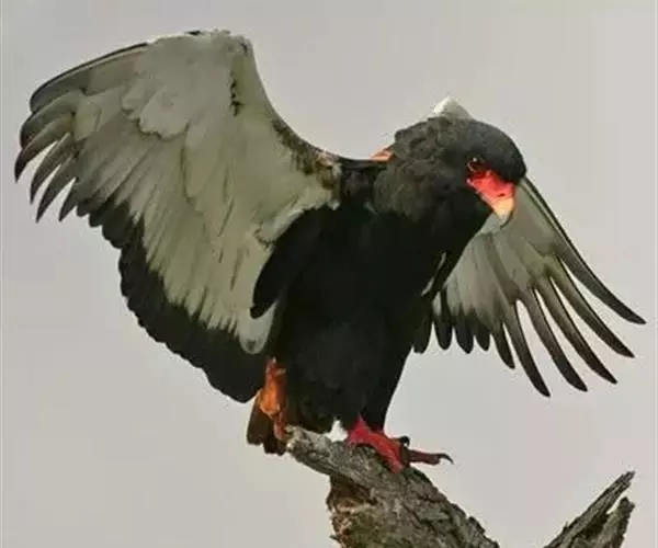 短尾雕也是一种大型食蛇的猛禽,在俄文里它被称为“小丑雕” (ОРЁЛ-СКОМОРОХ),因为它像马戏团的小丑将脸庞涂抹的红彤彤的,而且它还“套了一条鲜红色紧身裤”(它的腿也是红色的)。它的翅膀长而尾巴短,当它静止时收拢的翅膀完全掩蔽了尾部,好象它的尾巴一样。有人说短尾雕是飞机的原型。它身上的羽毛以黑色为主,椭圆的一枚枚羽毛支棱着,蓬松、美丽。在它的背上装饰着两块棕色的斑块,每一枚羽毛有清晰的圆形的羽缘,象精致的花边。
