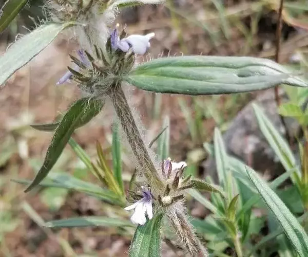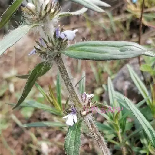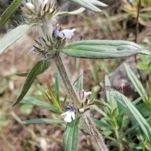 线叶筋骨草(5张) 多年生草本, 直立, 具分枝, 全株被白色具腺长柔毛或绵毛, 高25-40厘米, 根部膨大, 木质化。茎四棱形, 淡紫红色, 基部木质化, 嫩枝绿色, 多毛。叶柄极短, 具狭翅及槽;叶片纸质或近膜质, 线状披针形或线形, 长4-9厘米, 宽0.5-1.5厘米, 先端极钝或圆形, 基部渐狭, 下延, 抱茎, 边缘多少有缺刻或具波状齿, 具长柔毛状缘毛, 上面被疏糙伏毛, 下面通常于叶脉上被毛, 中脉在上面平或微凹, 下面显著。轮伞花序在茎中部以上着生, 向上渐密, 排列成穗状花序;苞叶与茎叶同形, 无柄。花萼漏斗状, 长6-7毫米, 外面在齿上毛最多, 内面无毛, 萼齿5, 狭三角形或线状狭披针形, 长为花萼的3/5, 整齐, 先端渐尖, 密具长柔毛状缘毛。花冠白色或淡蓝色, 具紫蓝色斑点, 筒状, 挺直, 藏于萼内, 两面被疏微柔毛, 内面近基部有毛环, 冠檐二唇形, 上唇极短, 直立, 圆形, 先端微缺, 下唇宽大, 伸长, 长6-8毫米, 3裂, 中裂片扇形, 先端圆形或微凹, 侧裂片线状长圆形。雄蕊4, 二强, 弯曲, 伸出, 花丝几无毛。花柱粗壮, 无毛, 与雄蕊等长或略短, 先端2浅裂, 裂片细尖。花盘环状, 裂片不明显, 前面呈指状膨大。子房4裂, 无毛。小坚果倒卵状或长倒卵状三棱形, 背部具网状皱纹, 腹部几为果脐所占。花期4-5月, 果期5月以后, 有的植株11月仍有花果。