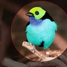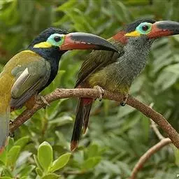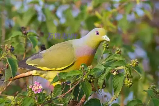 雌鸟和雄鸟的羽色相似,但胸部没有紫色和橙色的带斑,与腹部同为绿黄色,尾下覆羽较淡,为淡棕黄色,背部、肩部有较多棕褐色。