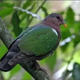 橙胸绿鸠(学名:Treron bicinctus)体长24-29厘米,体重135-200克。是中等体型的绿鸠。黑色的翼上具醒目的黄色纵纹和翼缘。脸前部绿色,颈背及上背灰色。雄鸟下体黄绿,上胸淡紫,下胸橘黄;雌鸟胸部绿色。尾灰色,外侧尾羽具黑色次端斑。