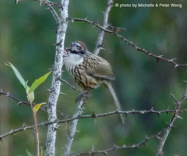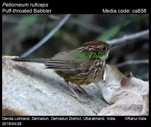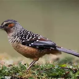 大噪鹛:中型鸟类,体长32-36厘米。额至头顶黑褐色,背栗褐色满杂以白色斑点,…