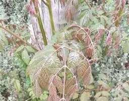 常绿灌木或小乔木,高1.5-3(-8)m,全株均被黄黄色柔毛。小枝具有黄白色皮孔。奇数羽状复叶互生,长20-40cm;小叶5-11,通常7,对生,卵状披针形,长4-11cm,宽2-4.5cm,先端渐尖,基部宽楔形,偏斜,边缘具三角形粗锯齿,上面疏被、下面密彼伏柔毛,脉上尤密。聚伞状圆锥花序腋生,狭长,可达50cm;雄花序长过于叶,萼片4,卵形,长不及1mm,外面流被淡黄色硬伏毛,边缘疏生腺体,花瓣4,长圆状披针形,外面有硬毛,边缘有腺体,雄蕊4,花盘发达,半球形;雌花序短于叶,萼片、花瓣同雄花,但稍大,雄蕊具不发育的花药,花盘杯状,4浅裂,心皮通常4,卵圆形,无毛,花柱反折,紧贴子房。核果椭圆形,紫红色转黑色,长约8mm,宽5-6mm,干时具凸起的网状皱纹,略偏斜。花期4-6月,果期8-10月