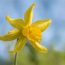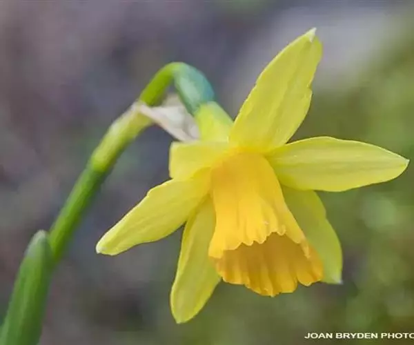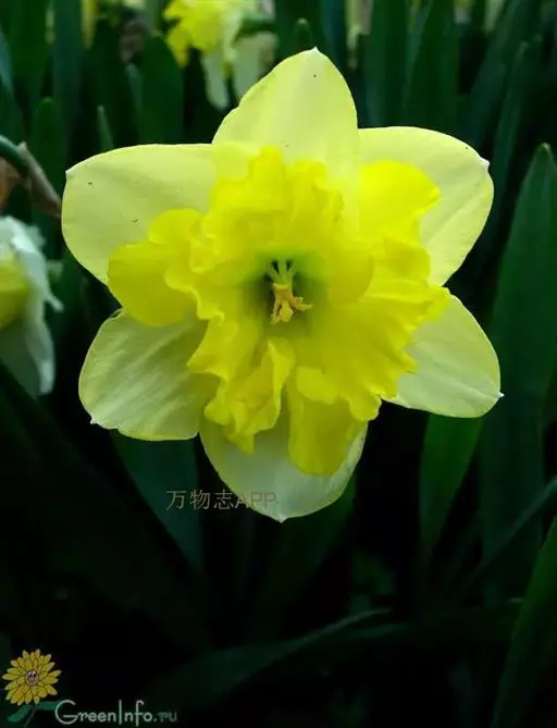 黄水仙为多年生草本。有皮鳞茎卵圆形。直径2.5-3.5厘米。叶4-6枚,直立向上,宽线形,长25-40厘米,宽8-15毫米,钝头。花茎高约30厘米,顶端生花1朵;佛焰苞状总苞长3.5-5厘米;花梗长12-18毫米;花被管倒圆锥形,长1.2-1.5厘米,花被裂片长圆形,长2.5-3.5厘米,淡黄色;副花冠稍短于花被或近等长。花期春季。