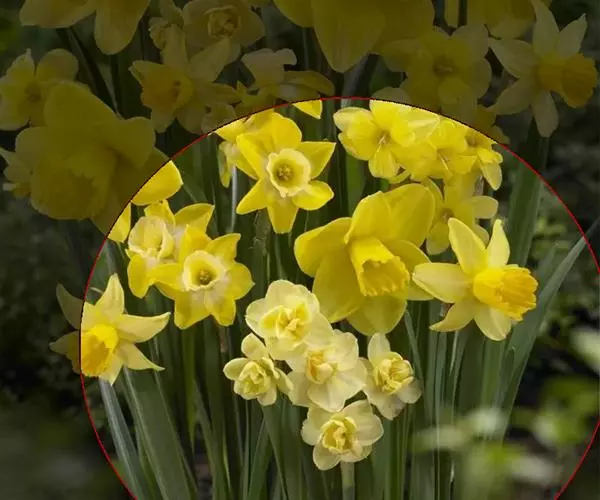 黄花重瓣的有迪克·怀尔登、副冠深橙色的塔希提、副冠橙色的得克萨斯和多头的黄乐。