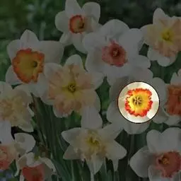 重瓣的有新娘花冠,副冠黄色,多头;快乐,多头;花漂,副冠橙色;白狮,副冠黄色。