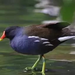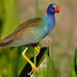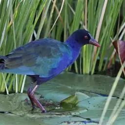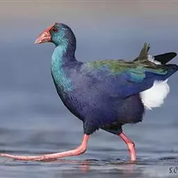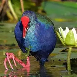 紫水鸡(学名:Porphyrio porphyrio)是鹤形目秧鸡科的鸟类,中型涉禽,共有13个亚种。体长约44厘米。嘴粗壮,鲜红色,短而侧扁;鼻沟浅而宽,鼻孔小而圆,在鼻沟前部下方,额甲宽大,后缘呈截形,橙红色。翅圆形,第2枚、第3枚和第4枚初级飞羽最长,并几乎等长;第1枚和第6枚或第7枚初级飞羽等长。跗蹠和趾长而有力,暗红色;能用脚趾抓住和操纵食物,这在秧鸡科中很特殊。两性同型,体羽大都为紫色或蓝色,尾下覆羽白色,翅和胸蓝绿色。栖息于江河、湖泊周围的沼泽地和芦苇丛中。以昆虫、软体动物、水草等为食。